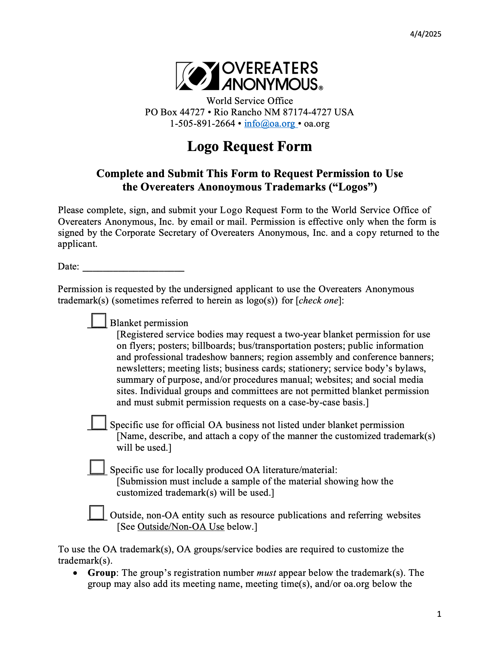 Please complete, sign, and submit your Logo Request Form to the World Service Office of Overeaters Anonymous, Inc. by email or mail. Permission is effective only when the form is signed by the Corporate Secretary of Overeaters Anonymous, Inc. and a copy returned to the applicant.