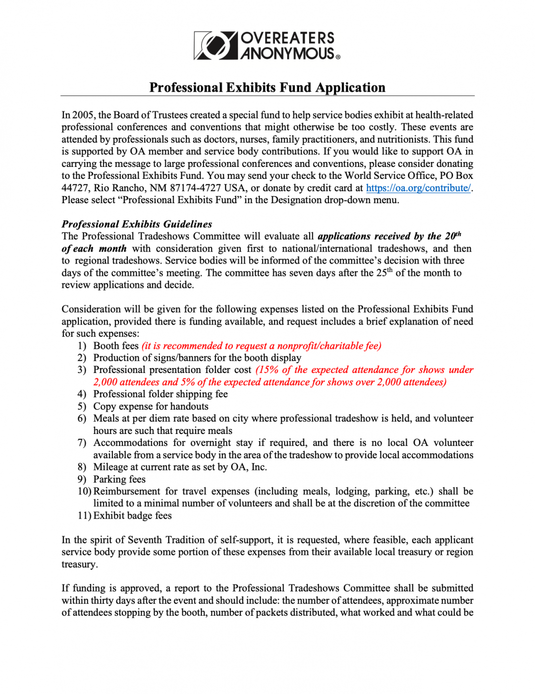 The Professional Exhibits Fund ONLY provides funding for professional presentation folders (refer to Item 3 on page 1 for specific quantities). All other literature can be purchased at a reduced cost through the Reduced Cost Literature Program. Please refer to the Reduced Cost Literature Application at https://oa.org/document-library under category, Outreach to Professionals. NOTE: If your service body is submitting a reduced cost literature application with the Professional Exhibits Fund application, a trustee does not need to sign the reduced cost literature application. The Professional Tradeshows Committee will review and approve.