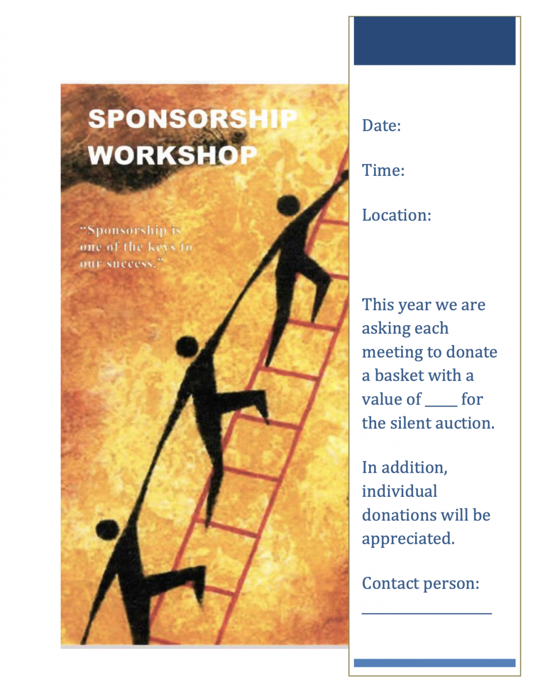 - Silent Auction: Tables with baskets for the silent auction need to be set up a half-hour prior to the start of the workshop to give attendees time to browse and bid on baskets. Each group brings a basket to donate to the silent auction fundraiser.