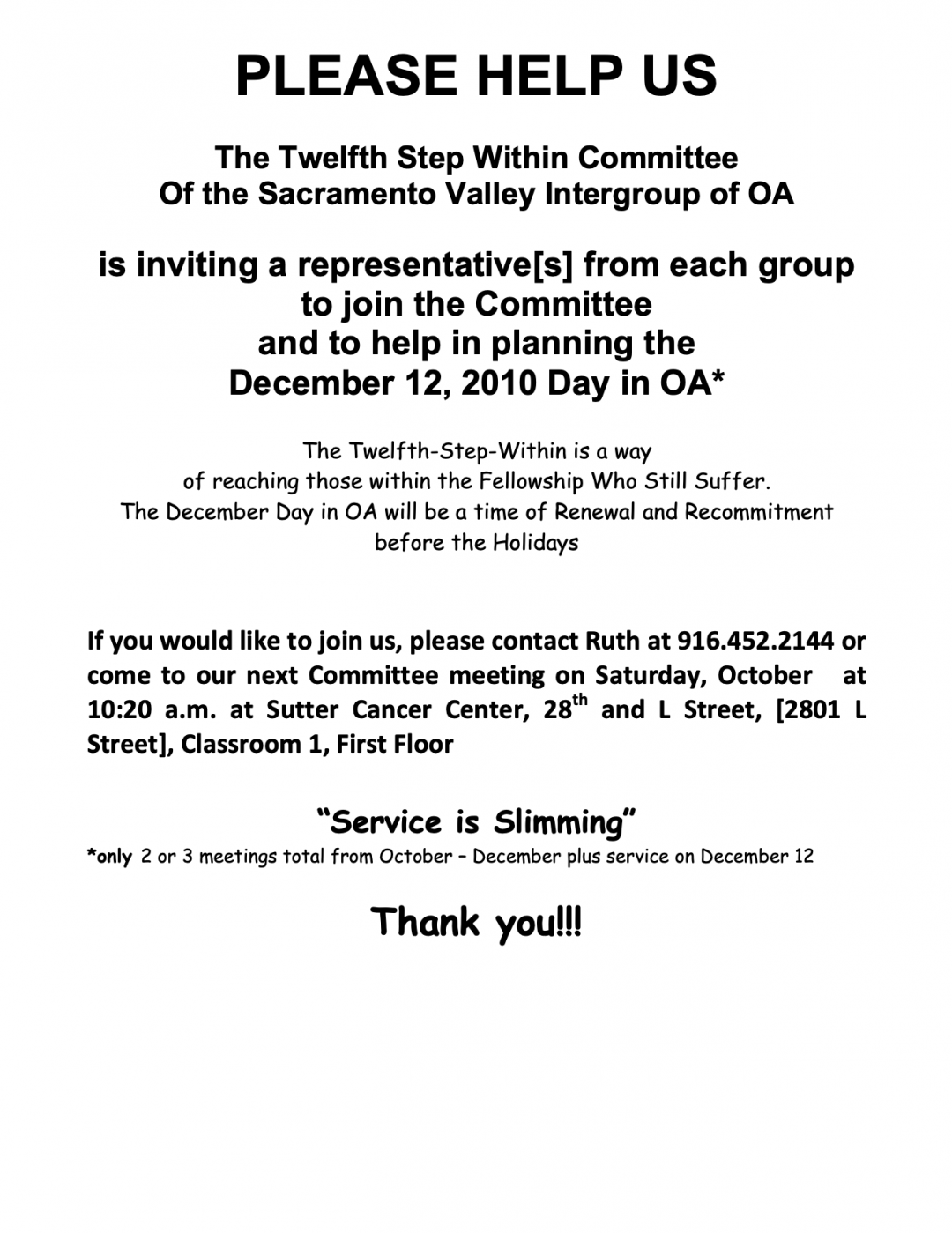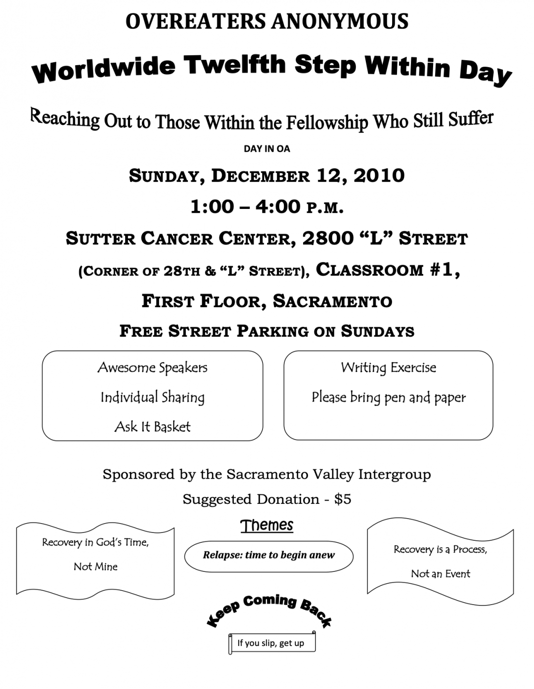 Committee members create and make copies of the flyers, and post on intergroup website (see attachments). Need a copy for each attendee to be downloaded from World Service Office website oa.org: